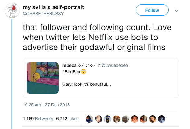 The success of such a mediocre movie as Bird Box proves that when done right, memes can be just as, if not more effective than traditional marketing. Keeping this in mind, conspiracy theories have been hatched that Netflix has been carefully orchestrating the phenomenon through the use of bots. However, a company representative spoke on the matter unofficially, stating: “the meme content happened on its own and spread organically.” Overall, the forced meme conspiracy theories have largely been debunked, with most of the claims being based on one tweet: