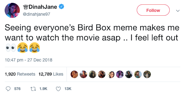 Open Twitter, Instagram or Snapchat during peak Bird Box frenzy, and you were sure to be greeted by a barrage of memes and videos of people completing the #BirdBoxChallenge. The hashtag began in early December after Netflix presented a group of popular Twitch gamers with the “challenge” of playing their favorite video games blindfolded in order to drum up excitement for the upcoming release. What ensued was a surge of similar videos of people performing everyday tasks blindfolded. Not to mention that watching characters navigating clumsily around in blindfolds proved to be a gold mine for the creation of memes. In the blink of an eye, Bird Box became a viral sensation.